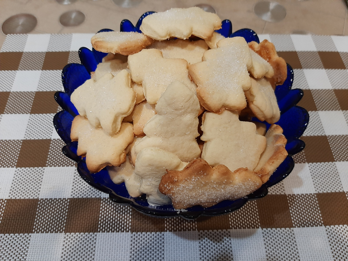200гр сл масла(можно маргарин), Щепотка соли,100гр сахарной пудры или сахара, 1,5гр ванилина, 1 яйцо, 300-400гр муки.Масло комнатной температуры взбейте с сахарной пудрой,добавьте соль,ванилин и яйцо.Все хорошенько взбейте.Затем добавьте муку и замесите тесто.Уберите тесто на 30мин в пищевой плёнке в холодильник . Затем присыпав стол мукой раскатать тесто толщиной 1см.Вырезать формой печенье и просыпать сахаром. Выпекать при температуре 180градусов мин 15.Ориентируйтесь каждый на свою духовку.Печенье получается хрустящее.Если вы хотите чтоб печенье было очень мягким,то добавьте в тесто 100гр сметаны.Приятного аппетита !