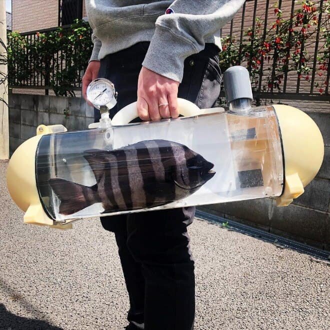 Очередная безумная поделка японских мастеров - сумка для желающих выгулять свою рыбу. Японская компания «Ma Corporation» в настоящее время работает над необычным портативным контейнером-аквариумом для живой рыбы под названием «Katsugyo», подходящим как для владельцев домашних животных, желающих взять свою любимую рыбу на прогулку, так и для любителей супер-свежих сашими.