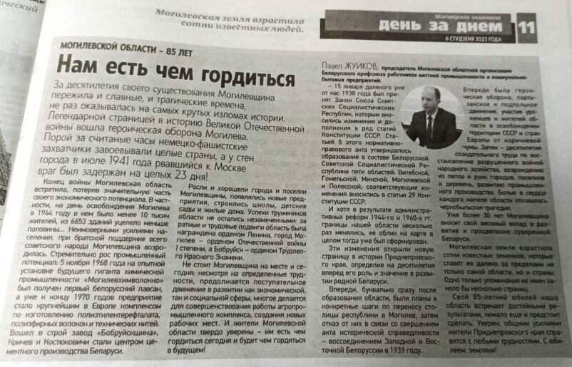 Размышлениями о приближающейся дате поделился председатель Могилёвской областной организации Белорусского профсоюза работников местной промышленности и коммунально-бытовых предприятий Павел ЖУЙКОВ: – 15 января далёкого уже от нас 1938 года был принят Закон Союза Советских Социалистических Республик, которым вносились изменения и дополнения в ряд статей Конституции СССР. Статьёй 5 этого нормативно-правового акта утверждалось образование в составе Белорусской Советской Социалистической Республики пяти областей: Витебской, Гомельской, Минской, Могилёвской и Полесской; соответствующие изменения вносились в статью 29 Конституции СССР. И хотя в результате административных реформ 1944 г. и 1960-х гг. границы области несколько раз менялись, её облик на карте в целом тогда уже был сформирован. Эти изменения открыли новую страницу в истории Приднепровского края, определив на десятилетия вперёд его роль и значение в развитии родной Беларуси. Впереди, буквально сразу после образования области, бы