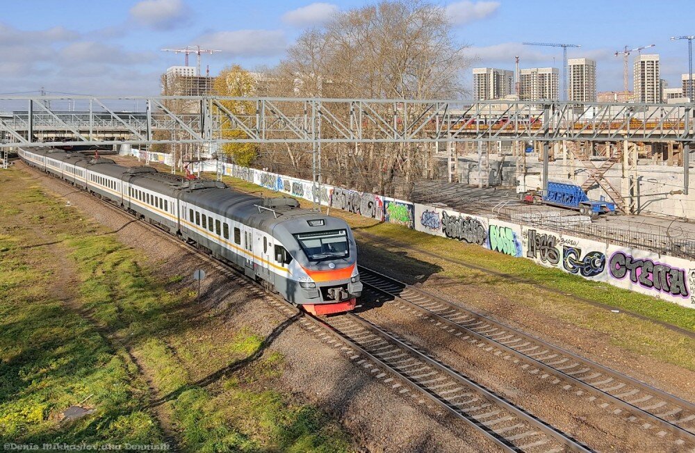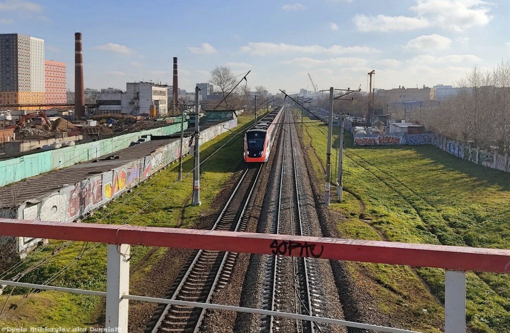 Вперёд, мои дорогие читатели! Продолжим наш поход. Но сначала посмотрим с безымянного путепровода вниз. Вот ЭП2Д едет куда-то в сторону Подмосковья: А навстречу ей - "Иволга" в сторону Нахабино: Бывший Московский жировой комбинат, и строящийся на его территории ЖК "Волжский Парк": По другую сторону насыпи - ещё действующий комбинат ЖБИ-6. А на самой насыпи кто-то турник соорудил. А что, неплохое место для занятий спортом - вокруг никого: А впереди виден входной светофор станции Новопролетарская: Тут на рельсах уже заметен небольшой накат: Бывший подъездной путь бывшего Мосжиркомбината: А ближе к горловине станции накат ещё заметнее: Квартал старых домов на 1-м Грайвороновском проезде: Оглянемся назад: А на станции Новопролетарская работа уже присутствует: Станционные тупики. Возможно, когда-то эти пути продолжались дальше, и вели на Московский желатиновый завод, чью территорию видно слева. Но в 2000 году завод был обанкрочен, производство свёрнуто, и сейчас это всё называется бизнес-па