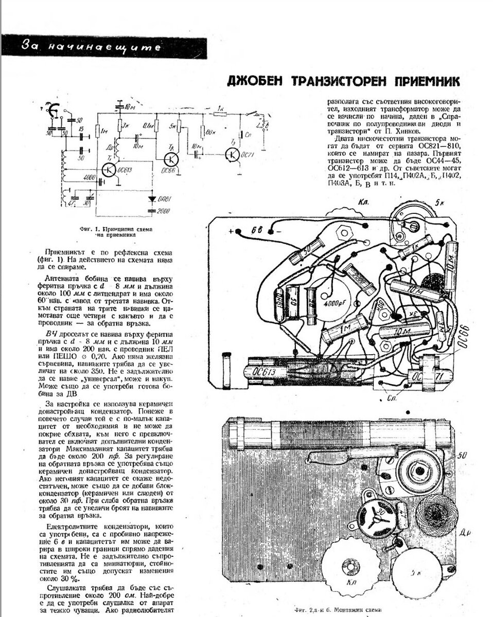 Добрый день дорогие друзья. С наступающим Вас Рождеством Христовым По многочисленный просьбам моих читателей, сегодня мы продолжим делать обзоры, говорить и смотреть, что собирали зарубежные радиолюбители в 60-х годах прошлого века на примере журнала «Радио и телевизия» наших болгарских друзей, начатый на моем канале в публикации «Чем занимались и что собирали зарубежные радиолюбители в 60-х годах прошлого века.» Журнал во многом похож на наш журнал «Радио», начало журнала отведено под пропаганду, в журналах появилась рубрика «Для начинающих», и в ней опубликована статья о рефлексном приемнике. Привожу статью полностью. Сканы из журналов, я размещаю с довольно большим разрешением, чтобы Вам удобно было их просматривать. Схема приемника немного необычна, диапазон принимаемых волн меняется подключением параллельных конденсаторов к входному контуру. На следующем рисунке транзисторный омметр. В его конструкции можно применять советские транзисторы П2А, П2Б, П6А, Пl3, П25, П26 и др. Еще