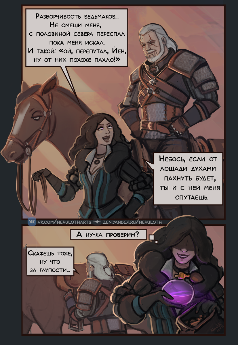Утопцы, виверны, гули...Все они меркнут перед злейшим врагом ведьмака -духами "Сирень и крыжовник". При рисовке этого комикса ни одна Плотва не пострадала. (да и вообще ей не привыкать) Иногда так случается, что чутье ведьмака подводит и тогда остается полагаться только на известный ведьмачий нейтралитет. (А то как не выбирай из двух зол, обязательно огорчишь какую-нибудь чародейку) Спасибо, читатель, что добрался аж до сюда! Особый респект тебе за поддержку, это очень вдохновляет и мотивирует меня творить дальше.