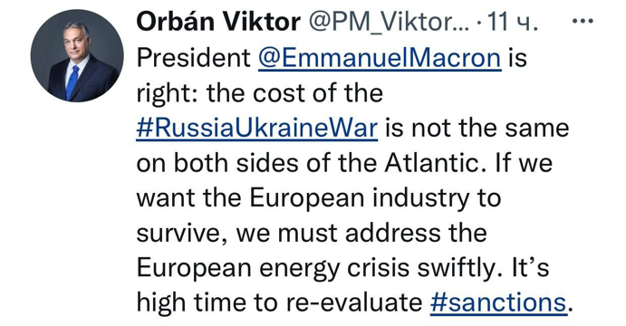 6 декабря 2022 г. появилось сообщение Виктора Орбана в социальной сети Twitter. После слов Эммануэля Макрона об обратном эффекте антироссийских санкций венгерский лидер согласился с французским коллегой и написал, что санкции должны быть переосмыслены, так как они в первую очередь бьют по европейской промышленности.