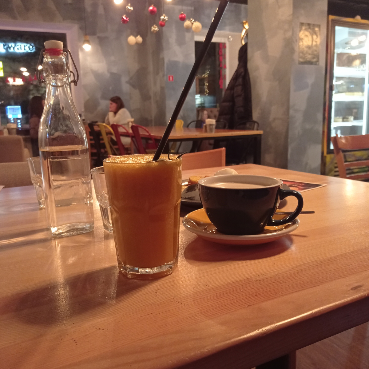 Всем привет!!! Поздравляю всех с Рождественским Сочельником и наступающим Рождеством Христовым!!! Вчера в ожидании молодежи из кинотеатра, решили с мужем погулять. Гулены из нас конечно получились не очень, вроде и оделись тепло, я в шубе, но к морозу оказались не готовы морально видимо 😁 По центру прокатились, по двум берегам Волги через мосты, на машине. Повосторгались нарядным городом, подсветкой , очень красиво в центре .Особенно недавно отстроенный заново храм и Путевой дворец в вечерней подсветке. Вблизи не так красиво, а издалека супер. Потом решили пройтись пешком по одной из старинных улиц Твери, там тоже всё горит и сверкает, но прошли метров 100😂Мужа начало трясти от холода и мы быстренько нырнули в ближайшее кафе. Замерзшему мужу цитрусовый РАФ, а мне манговый смузи. Я, как вечно голодная заказала ещё теплый салат. Не подумайте, я не проглот, просто пока готовила стол для гостей на день рождения дочки, в результате за столом почти не ела. Нравится мне это заведение, тихо,