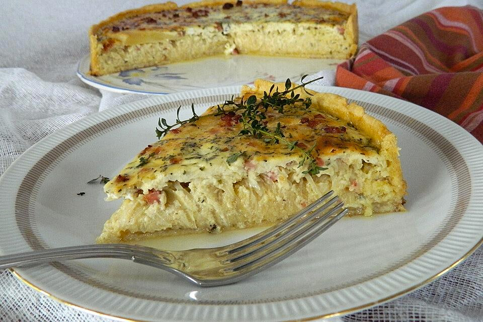 Странное на первый взгляд сочетание, которое дает удивительный вкусовой эффект – лук и яблоки. А еще – основа из песочного теста. Пирог этот может служить как перекусом, так и завтраком. Ну а любители могут и к чаю подать – если сладкое не хочется. Берем: Для теста – · 200 гр. муки · 100 гр. масла · Щепотку соли · 1 яйцо Для начинки – · 150 гр. бекона ( с хорошими мясными прожилочками) · 500 гр. лука · 150 гр. сыра с плесенью · 1-2 яблока · 250 гр. сметаны или сливок высокой жирности · 3 яйца · 1 столовую ложку сухого тимьяна · 1 столовую ложку муки · Соль по вкусу Как готовим: Из ингредиентов для теста замешиваем песочное тесто и отправляем его в холодильник – пока готовим начинку. Бекон нарезаем кусочками, лук – тонкими полукольцами. Яблоко натираем, сыр – разминаем вилкой. Теперь на сухой сковороде обжариваем бекон, достаем его и в оставшемся жире обжариваем лук. Смешиваем сливки, яйца и муку, подсаливаем. Половину этой смеси смешиваем с сыром, яблоком, луком и двумя третями бек