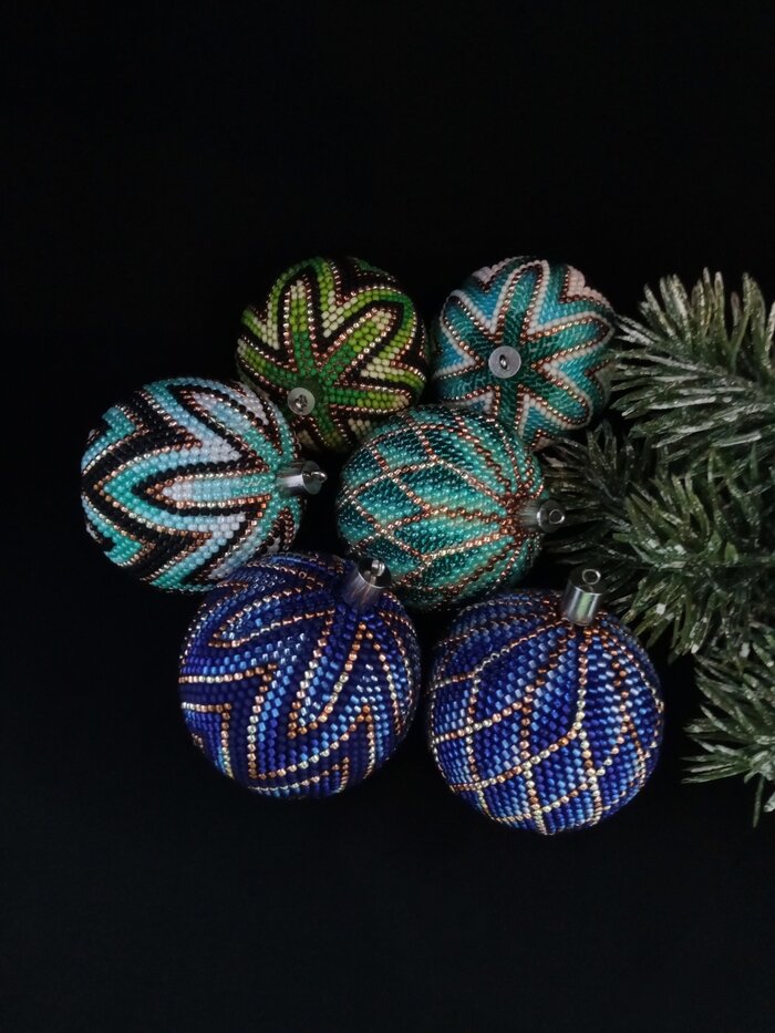 Есть схемы, по которым хочется связать. А есть схемы, от которых не оторваться. И вяжешь разные варианты, а в голове ещё 100500 цветовых сочетаний. По такой схеме у Альбины Тезиной в ноябре-декабре прошёл совместник "Переливы". Первый шарик к совместник был синий. Связан из японского бисера Toho 11/0. В работе 7 цветов, нитки - итальянский ирис, крючок 0.75. Вяжется с петлёй подъёма. Основа - пластиковый шар 5 см. После синего, пришло чёткое понимание, что хочется ещё. Пошуршала по своим запасам, подобрала четыре разных варианта. Остановилась на зелёном и почти закончила набор, но тут меня постигла неудача - кончился салатовый бисер, не хватило совсем чуть-чуть. Пришлось отложить до лучших времён. В ход пошёл запасной план, точнее подбор номер два из бирюзового чеха. Примерно в это же время появилась схема "Переливы 2". Если первые проходили под кодовым названием "Зигзаги", то вторые окрестили "Ромбы". Нужно было четыре цвета на фон и я, немного побегав по потолку со стенаниями "У меня