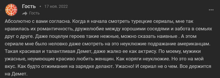Прежде, чем приступить к просмотру, решила почитать комментарии тех, кто уже успел посмотреть сериал. Выдержки выше - это комментарии зрителей к первой серии сериала на одном довольно популярном ресурсе. Прочитав их я была как минимум заинтригована, что там такое сняли с участием Демет, развращающее турчанок 😁