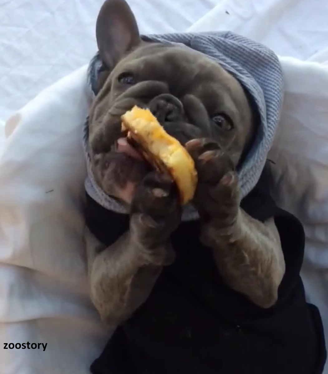 Французский бульдог по кличке Блюнджи очень любит своего хозяина. Чтобы привлечь его внимание, пес готов на все. Опекун записал, что умеет делать его собака. Французский бульдог решил вести себя как человек и начал есть лапами. Собака даже не хочет есть из миски. Поскольку его владельцы едят руками, он также может использовать свои передние лапы. Ведь «ничего сложного в этом нет». Когда Эван и Санни Ошан принесли домой своего щенка французского бульдога, они сразу заметили в нем что-то необычное. Собака родилась глухой. Возможно, это повлияло на его поведение и объясняет загадку того, почему он ест передними лапами. Бульдог пытается потреблять пищу так же как человек. Он просто берет еду в руки и кладет в рот. Бульдогу уже 3 года, но он совсем не изменил свой стиль питания. Он продолжает держать еду в лапах. Таким образом, он может есть пищу вместе со своими хозяевами. Когда Эван заметил, что делает его питомец, он решил пойти дальше и одеть его для совместного приема пищи, и записать