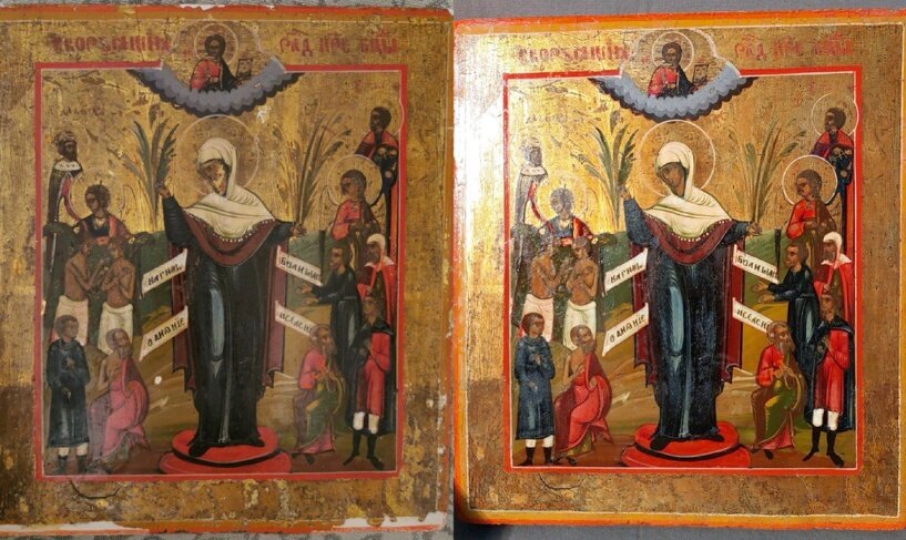 В Омский государственный историко-краеведческий музей вернулись иконы «Святой Пантелеймон», «Николай Чудотворец», неизвестная святая и «Богоматерь». Иконы отправили в 2021 году в Московский государственный академический художественный институт имени В.И. Сурикова для реставрации. Все иконы относятся к XIX веку. «Часть из них была передана в составе коллекций предметов культа, собранных в 1972–1979 годах в одном из районов Омской области. В музей они поступили в плачевном состоянии, на образах были трещины по дереву, царапины, фрагментарные утраты красочного слоя, грунта и потертости позолоты», — сообщил минкульт Омской области. Иконы до и после реставрации «Новый» иконы можно будет увидеть на экспозиции в Петровском зале краеведческого музея в рамках проекта «Святые лики» в 2023 году. Ранее портал Om1.ru сообщал, что в рождественскую ночь в омских храмах проведут праздничную литургию. Подробнее. Читайте также на портале Om1.ru В рождественскую ночь в омских храмах проведут праздничну