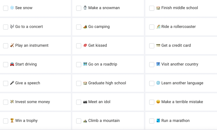 Уже успели поменять карьеру? А прыгнуть с парашютом? Новый год — время осмыслить опыт, который вы получили, и определиться с масштабными планами и целями на следующие 365 дней. Поможет сайт, где собраны 66 распространенных событий и этапов, через которые человек проходит на протяжении жизни.