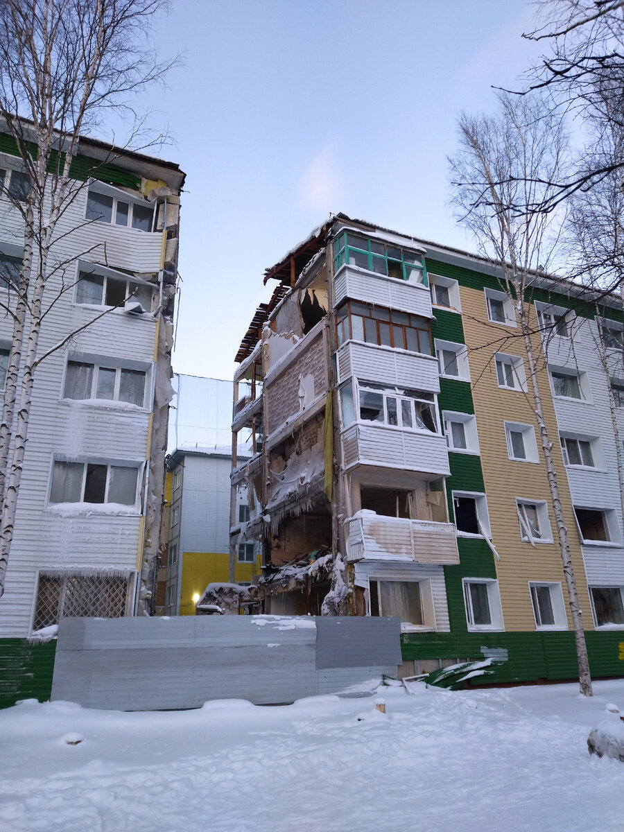 В начале декабря в Нижневартовске (город, где я живу)взорвались газовые баллоны в одной из квартир в пятиэтажке. Сложился практически весь подъезд. Погибло в итоге около 10 человек, но некоторым жильцам подъезда повезло - кого-то не было дома, а кого-то взрывной волной выкинуло с балкона (3-4 этаж) в сугробы и они не получили никаких ранений. Сегодня сходил посмотрел что в итоге сделали с домом. Завалы разобрали, а весь проем (от крыши и до низу) очистили от тех нависающих кусков, что остались и могли в любой момент упасть вниз. В подъезд, в котором произошел взрыв, зайти нельзя. Дверь заперта на замок. В другие подъезды в первые дни тоже не пускали жителей, но сейчас они могут зайти, чтобы забрать вещи. На ночь как я понимаю, подъездную дверь тоже запирают - жить в доме нельзя, он весь пошел трещинами внутри. Людей расселили по гостиницам, вроде как, но новые квартиры дадут не скоро. В городе у нас много жилья строится и переселение из ветхого жилья происходит планомерно, но в