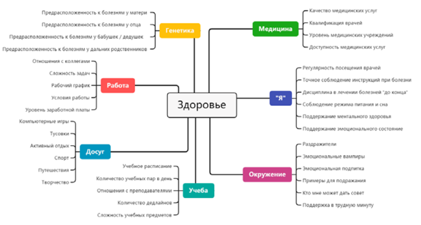 Хочу отметить, что правило волшебного числа "семь" неожиданно здесь сработало и весьма гармонично (на мой взгляд). Можно было бы добавить ветку "Спорт", но это часть "Досуга". Для меня было ВАУ, что здоровье не только физическая категория, но и психологическая - "Я".