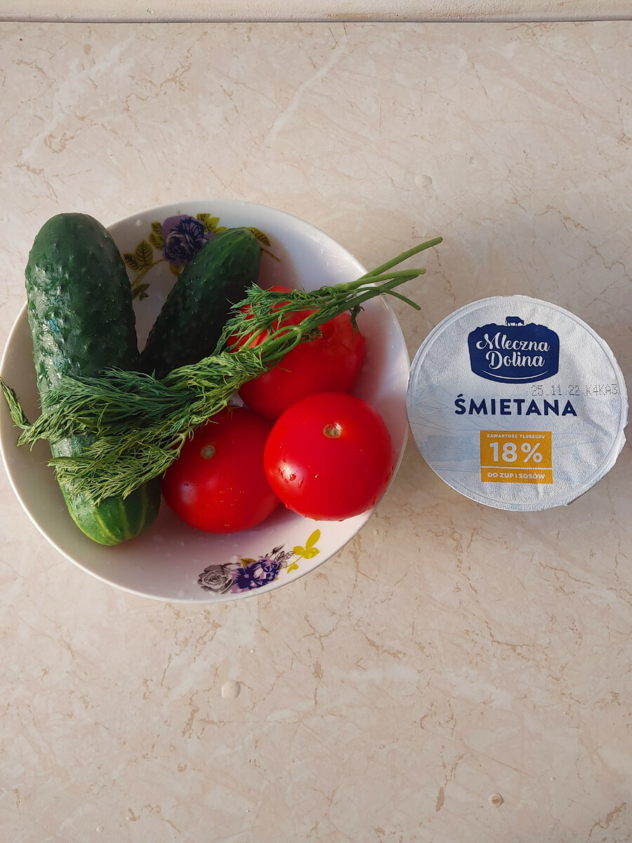 Иногда, на протяжении рабочего дня, или рабочей недели, хочется чего-то вкусного и свежего. К примеру салат. Все ингридиенты, на это блюдо, взяты из остатков прежних покупок, кроме сметаны: -помидор - 3 штуки; -огурец - 2 штуки; -сметана 18% - 200 грамм; -пара веточек укропа: Огурец и помидор нарезаеи кубиками, укроп мелко шинкуем и все ложим в тарелку для салата: Солим и заправляем сметаной: Тщательно перемешиваем. Салат готов: Десять минут мучений, а удовольствия - немеряно)) Приятного аппетита!