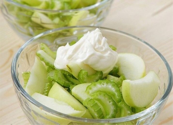 Доброго времени суток дорогие подписчики и гости моего канала!!! Сегодня предлагаю вам рецепт вкусного салатика всего из трёх ингредиентов. Сочетание сельдерея и яблока подарит вам удовольствие от вкуса и насытит организм большим количеством витаминов. Такой салатик подойдёт для праздничного стола, постного и вегетарианского меню. Ингредиенты: Стебель сельдерея 200 гр Яблоки кисло - сладкие 200 гр Лимонный сок 1-2 столовые ложки Йогурт белый натуральный для заправки Зелень по желанию Приступим: 1. Стебель сельдерея моем и нарезаем тонкими полукольцами. 2. Яблоки чистим от кожуры и сердцевины. Нарезаем кубиками или тонкими слайсами. 3. В подходящей ёмкости яблоки смешиваем с лимонным соком, добавляем сельдерей и заправляем йогуртом. 4. Соль по вкусу, зелень по желанию. 5. Охлаждаем салат в течении часа и наслаждаемся просто восхитительным вкусом. Вкусный и полезный салат порадует всех кто хочет разнообразить свой рацион и ведёт здоровый образ жизни! Приятного аппетита!!! Не забывайте,