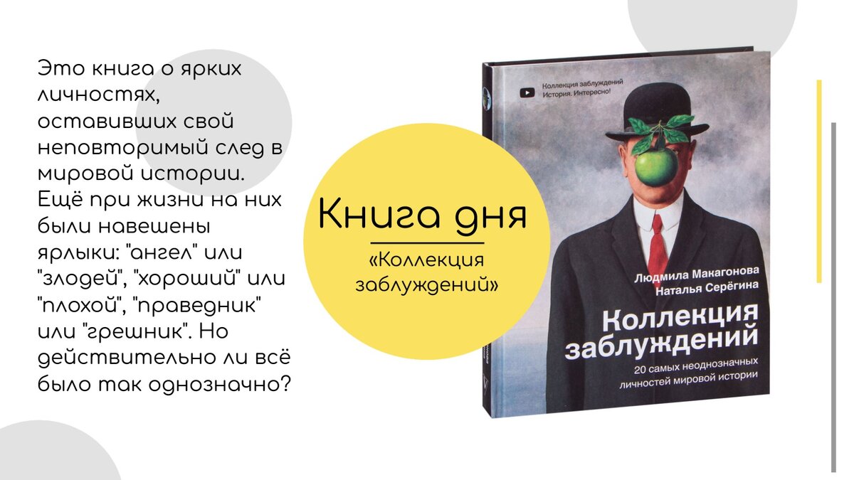 Приходя в нашу библиотеку, отдельное внимание стоит обратить на стеллажи с научно-популярной литературой. Там представлены книги, посвященные истории, психологии, биологии, археологии и эволюции. И в ближайшие дни мы познакомим вас с несколькими такими книгами, которые мы и наши читатели особенно выделяем. Полное название книги Людмилы Макагоновой и Натальи Серегиной – «Коллекция заблуждений. 20 самых неоднозначных личностей мировой истории». Отдельно хотелось бы выделить, что авторы фокусируются не на последних столетиях человеческой истории, а выбирают людей из разных эпох и периодов, начиная с Княгини Ольги и Князя Святослава – первых Рюриковичей. Помимо них в книге речь идет о Лукреции Борджиа, Леди Гамильтон, Екатерине Долгоруковой, Петре Столыпине, Вольфе Мессинге и Леди Диане. Большая часть личностей, выбранных для изучения, - женщины, что также является положительным моментом, так как в очередной раз напоминает, что женщины наравне с мужчинами создавали историю. «Коллекция забл