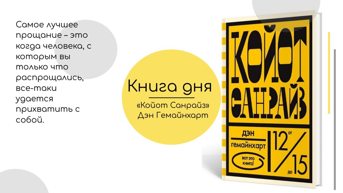 Дэн Гемайнхарт назвал своей произведение "Койот Санрайз" в честь главной героини - 12-летней девочки, путешествующей по всей стране со своим отцом. Но не дайте этому себя обмануть. Это не произведение про детство, становление, проблему отцов и детей. Это произведение про путь и причины, по которым мы в него отправляемся. Поездки на машине в компании папы - разве это не мечта для ребенка, не достигшего подростковых лет? Но вот что побудило их собрать вещи и покинуть привычный дом? Страх, боль, опустошение, разочарование, обида? И у каждого их попутчика свои причины. Цитаты из книги: Иногда боишься довериться людям, боишься так сильно, как будто ничего страшнее не бывает. Но знаете что? Ещё страшнее, неизмеримо страшнее справляться с чем-то в одиночку. Он выговорил моё имя так, как выговаривают его некоторые, показывая пальцами саркастические кавычки. Он выговорил моё имя так, словно это не имя, а смех один, последняя фраза анекдота, локоть, тычущий под рёбра. Но вот в чем ш