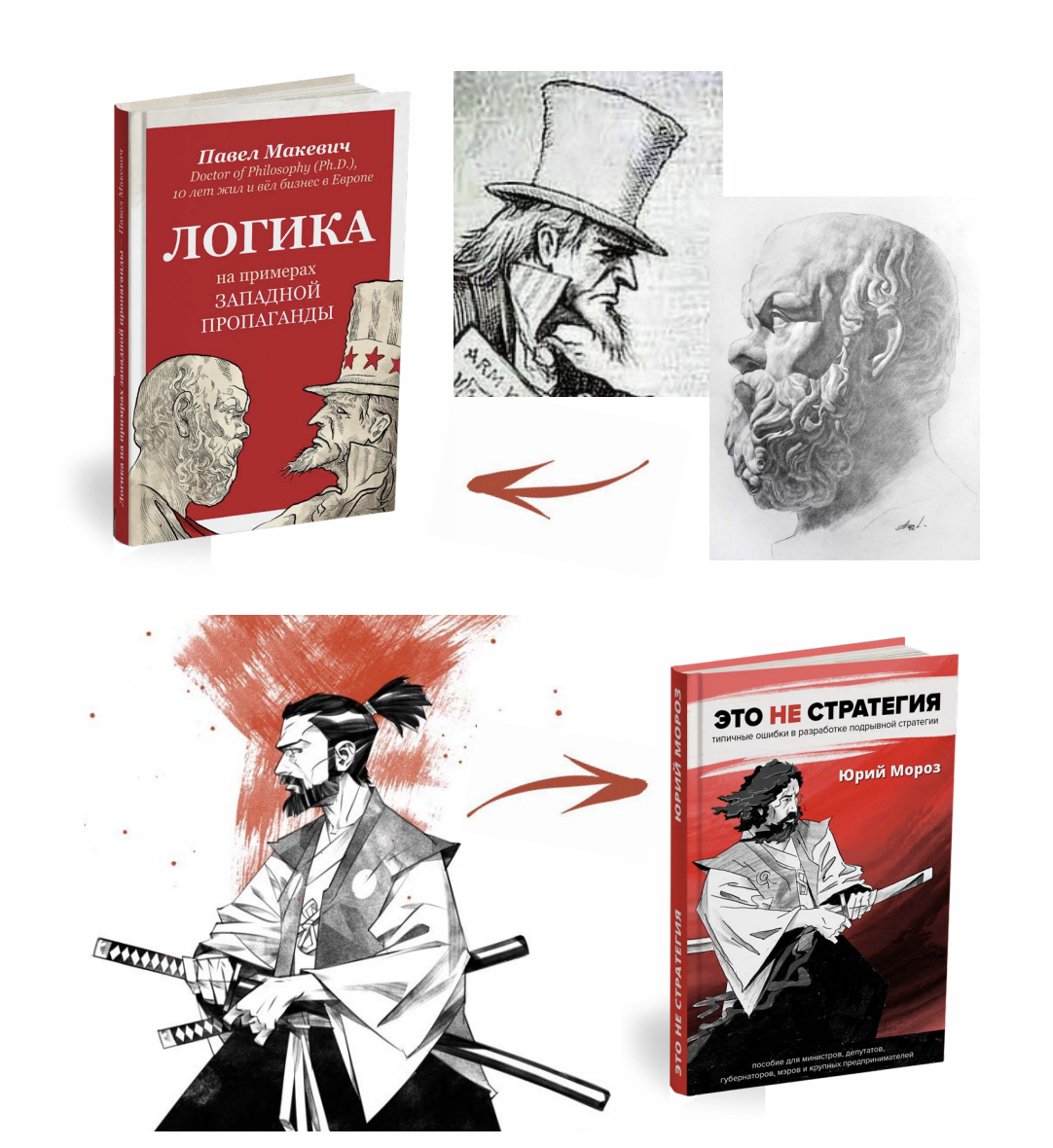 Я очень ленивый художник. Мне скучно рисовать фоны, выдумывать персонажей и вылизывать пиксели до бесконечности. Однако, мне очень нравится создавать композиции. Ярко и интересно доносить свои или чужие идеи. И когда передо мной стоит задача, я просто иду в поисковик и ищу нужные мне картинки. Одна плюс другая. Отсюда берём лицо, отсюда одежду, отсюда ракурс. И всё. Не нужно ничего выдумывать. Больше того! Открою страшную тайну: Довольно часто я просто «обрисовываю» в фотошопе нужную мне картинку. Часто изменяя её совсем не значительно. С точки зрения авторских прав, конечно, лучше купить такую картинку или взять фото со «свободным использованием». Либо уж изменить её до неузнаваемости. Однако в любом случае, для меня это тренировка. Так или иначе рука запоминает линии, образы и удачные «ходы» в композиции. Бонусом: я избегаю «творческих мук», которые творческими-то и не назвать. Так, отмазки для лентяев. Перед вами несколько примеров моих обложек. Как видите, сходство с референ