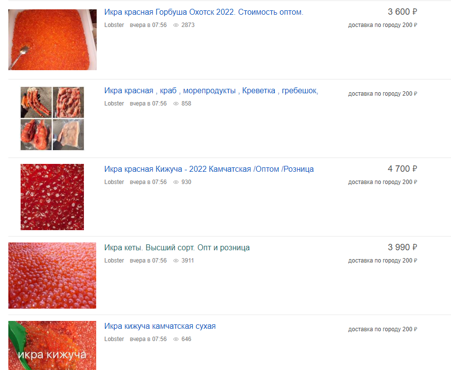 На сайте частных объявлений красную икру можно найти гораздо дешевле. Так, икра кижуча будет стоить около 4 500 рублей, а кеты - от 3 990 за улов 2022 года. Баночки с замороженным продуктом можно приобрести за 2 500. Но к таким предложениям необходимо относиться настороженно, так как не всегда у частных продавцов товар качественный.