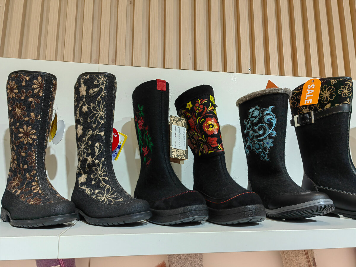 Приехала ко мне мама в Москву и говорит: " Нужны вяленые сапоги из шерсти, я года три назад свои покупала на ВДНХ, поедем еще раз поищем?" А где искать то обувь такую, если выставки на ВДНХ непостоянные, часто проходят и меняются экспозиции? Да и на ВДНХ в холодную погоду, если честно, ехать неохота. Ладно, поехали пока в обычный магазин за покупками и на мое счастье нашли мы нужную обувь...в детском магазине. Оказывается, теперь в магазине "Котофей", где я раньше племяннице покупала зимние сапожки из шерсти, есть одежда не только для мелких (причем раньше ее продавали исключительно для детсадовского возраста). Так что нашли мы наконец-то обувь и для взрослых. Размеры продаются до 46, есть модели и для мужчин. Размеры, правда, не все есть, но на некоторые модели зато скидки имеются. Оказывается, сеть магазинов детской обуви "Котофей" перепродает вяленую обувь от компании "Гуслицкие валенки". Наши покупки. Купили мы с мамой парочку. Она подобрала на свой 42 вот такую модель. Еще захва