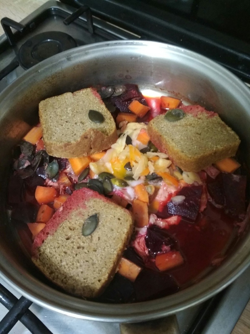 Заливаем воду на сковородку, подогреваем, укладываем свёклу на несколько минут. Далее морковь и яйцо. Ещё пара минут. Выключаем. Докладываем замоченные тыквенные семечки, полбяной хлеб, квашеную капусту.
