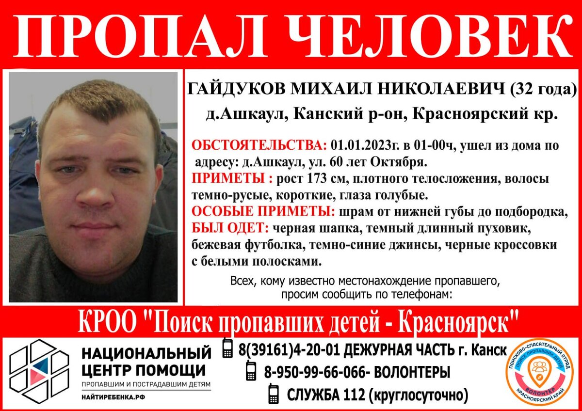 Во время празднования нового года пропал житель Красноярского края: Михаил Николаевич Гайдуков, 32 года, д.Ашкаул, Канский район 1.01.2023г. в час ночи ушёл из дома - деревня Ашкаул, ул. 60 лет Октября. ПРИМЕТЫ: рост 173 см, плотного телосложения, волосы тёмно-русые, короткие, глаза голубые. ОСОБЫЕ ПРИМЕТЫ: шрам от нижней губы до подбородка. БЫЛ ОДЕТ: чёрная шапка, тёмный длинный пуховик, бежевая футболка, тёмно-синие джинсы, чёрные кроссовки с белыми полосками. Контакты для связи: 8-950-99-66-066 волонтёры (круглосуточно). 8 (39161) 4-20-01 полиция Канска, «112» телефон экстренных служб. #новости #чп #Ачинск #Красноярск #Канск #Красноярскийкрай #Москва #Сибирь #Россия #объявление #пропалчеловек #розыск #поиск I i. Национальный центр помощи пропавшим и пострадавшим детям