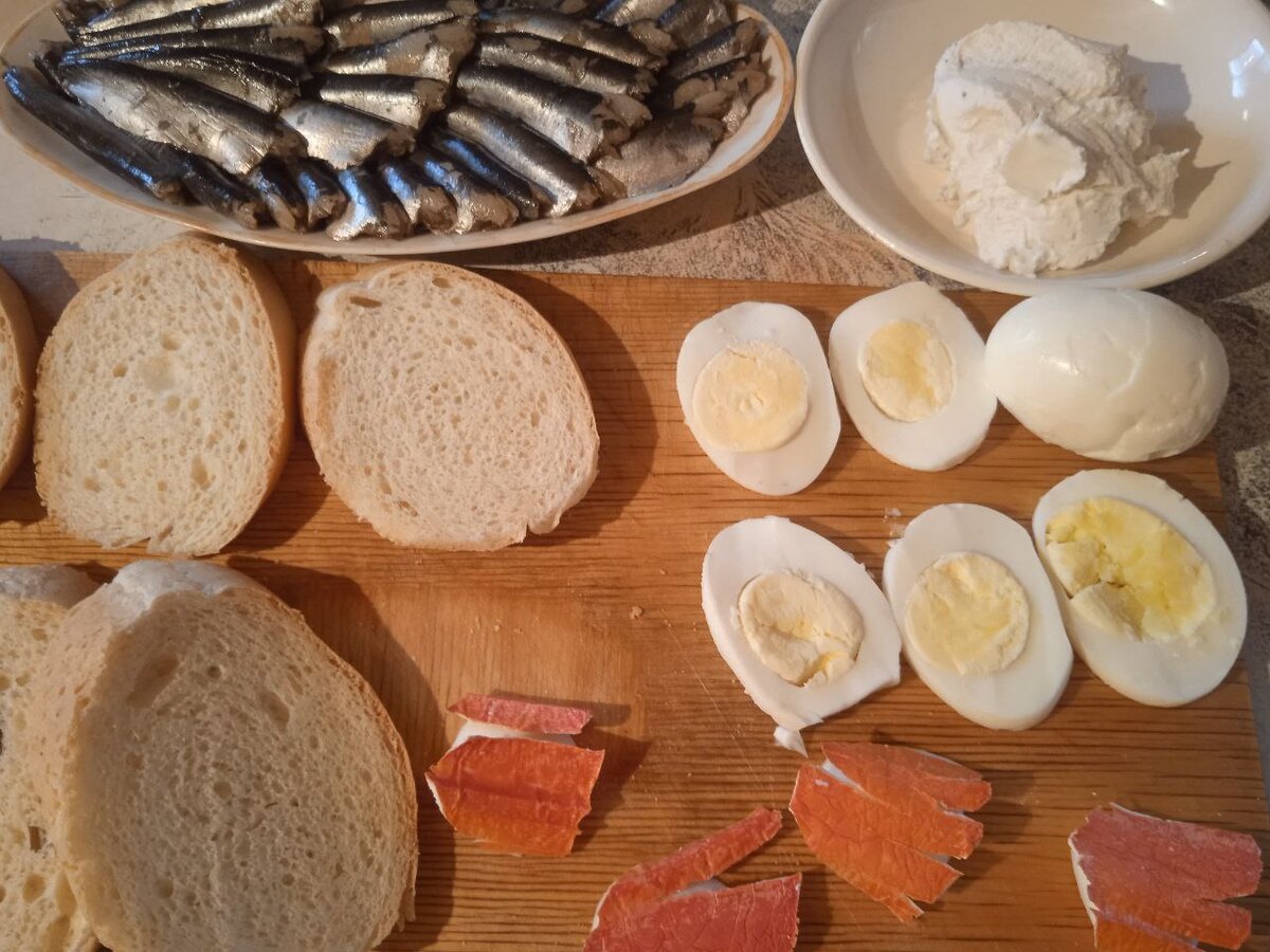 Всем добра и здравия! На гостевом ужине, второй холодной закуской были бутерброды - «деды морозы» с малосольной килькой. Простая и вкусная закуска, но нарядная и главное в тему новогодних праздников. Конечно же, солю кильку я сама, это делается просто, быстро, а вкус несравним с покупной рыбешкой. Это будет завтра, а сегодня готовим «Дедов морозов» - бутерброды с малосольной килькой. Бутерброды «Деды морозы» с малосольной килькой Рецептура Приготовление От батона отрезать 6 хлебных ломтиков и намазать их сливочным сыром, красиво уложить на них по три половинки чищенной соленой кильки. Яйцо разрезать вдоль, на ломтики и положить их на кильку, далее мастерим «дедам морозам» шапочки – для этого можно использовать четвертинки небольших, продолговатых помидор, шапки у «дедов морозов», будут красные, или четвертинки яиц, тогда шапки - будут белые. Используя помидоры, разрезав их, уберите семенную часть. Я делала шапочки из крабовых палочек, срезав с них красную поверхность и закрепив её на