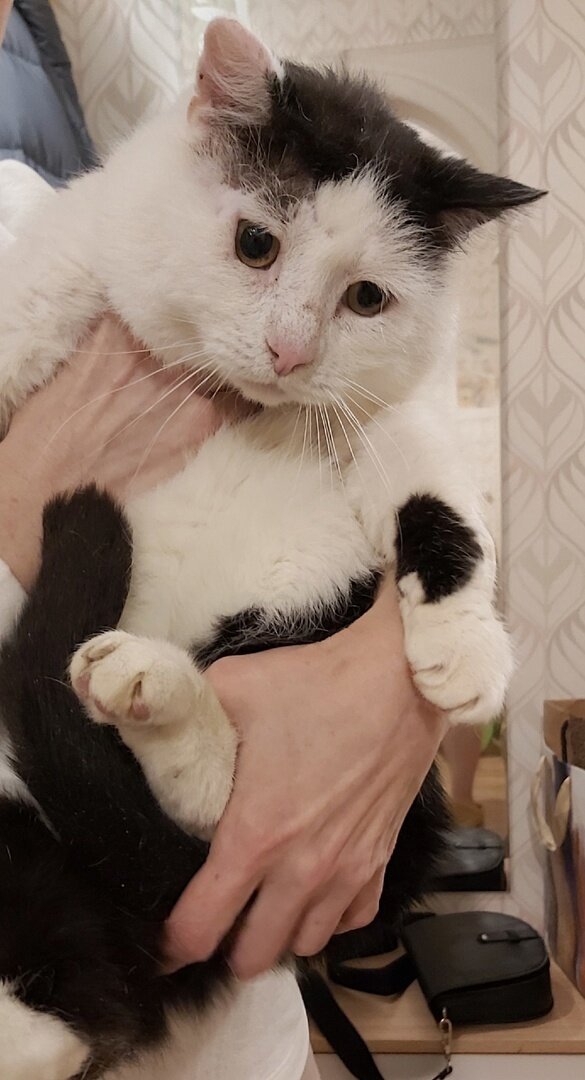 Его спасли с улицы в сентябре на Приморском шоссе Петербурга с гниющей раной на голове (гной, опарыши, высокая температура). Состояние было критическое, а вид у кота - не для слабонервных (все публикации ЗДЕСЬ). Женщина с большим человеческим сердцем организовала отлов и доставку кота к ветеринару. Кота подлечили, но это тоже отдельная история (см. ЗДЕСЬ). Из-за несвоевременной оплату услуг ветеринара куратор никак не могла получить информацию о состоянии кота. Да и кота не могла забрать. Но теперь все трудности позади. Благодаря вам, дорогие друзья, вашей финансовой помощи Серый Зайка уже на передержке. Зайка оказался невероятно ласковым, добрым, нежным, благодарным и очень интеллигентным котиком. Он даже кушает очень-очень аккуратно - ничего не разбрасывает. А если мяукает, то очень тихо. Вот ч