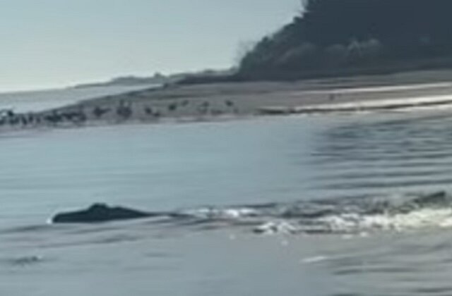На видео, снятое в районе Атлантик-Бич, огромный зверь высунул голову из воды и снова погрузился под воду. Также можно заметить хвост животного, напоминающий китовый. При этом голова существа больше всего похожа на голову крокодила.