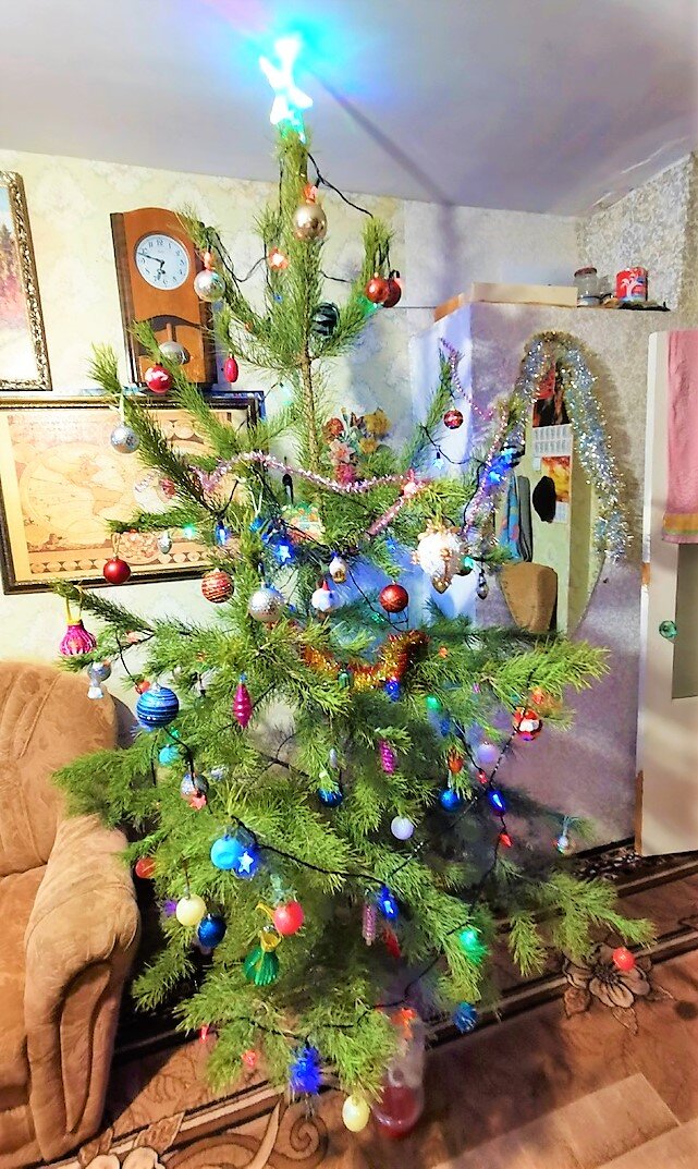 К нашему приезду в деревню дедушка нарядил для внуков (да и в общем-то для всех) живую ёлку (да простят меня противники живых ёлок на Н. Г. в доме). Сейчас на ней с каждым годом всё больше современных пластиковых, и уже меньше тех знаменитых советских ёлочных игрушек. Делались они из тонкого стекла, и поэтому, к сожалению, не очень долговечные. В те времена, наверное, они не так ценились, как сейчас. По крайней мере я не помню, чтобы мои родители особо переживали, если какой-нибудь экземпляр разбивался. Но зато сейчас немного расстраиваются, если какая-нибудь игрушка оказывается треснутой или поломанной во время хранения. Ведь с этими украшениями связаны приятные новогодние воспоминания из молодости. В каждой семье, наверное, есть такие драгоценности. Эти шары (было несколько разноцветных) мы обычно всегда вешали повыше, чтобы никто случайно не задел и не разбил их. Шишечка со звездой. Наверное, это была отсылка к Красной армии. Шишка посовременнее, но тоже ещё советская. Из пластмасс