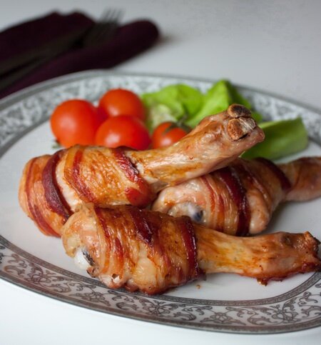 Когда хочется удивить близких простым и бюджетным блюдом, то я рекомендую вам именно этот рецепт! Гости и ваши близкие точно удивятся! Что нам понадобится? 🟣Куриные ножки 🟣Бекон 🟣Соль, перец 🟣Майонез и сметана 🟣Твердый сыр немного Приготовление Сначала маринуем ножки в майонезе со сметаной и не забываем солить и перчить. Хотя бы на полчаса оставить в холодильнике. Потом обматываем беконом ножки и раскладываем в противне, предварительно смазав маслом. И ставим духовку на 180-200 градусов. По времени не могу сказать точно, так как у всех духовки разные по мощности. От получаса до часа - то есть до готовности мяса. Потом посыпаем сверху сырком и еще на минут 5 в духовке. Если не знаете, сколько держать мясо в духовке, то каждые 10 минут после 30 минут готовки доставайте и протыкайте одну ножку ножом и смотрите, чтобы мясо было белым, а не розовым. Приятного аппетита! Вы пробовали такой рецепт? Напишите в комментариях