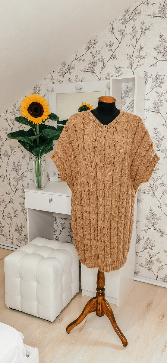 На высоте 66 см (на 16 косе), делим вязание пополам, посередине у нас 3 изн. п., для симметрии 2 петли провяжем вместе изн. и от этих 2-х средних петель формируем вырез и обе стороны заканчиваем раздельно.
