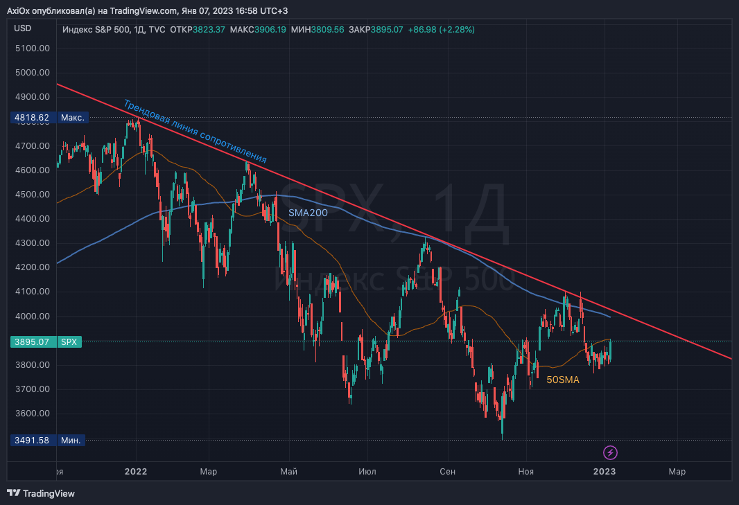 Индекс S&P 500 завершил календарный год снижением на -19,6%. С текущих уровней индексу необходимо подняться на 23,4%, чтобы восстановить прежние максимумы. Учитывая макроэкономические перспективы, это может занять некоторое время. Нисходящий рынок может быть охарактеризован этой устоявшейся линией тренда сопротивления. 200-дневная простая скользящая средняя находится в нисходящем тренде, а 50-дневная простая скользящая средняя колеблется, но все еще имеет тенденцию к снижению. К сожалению, пока нет четких доказательств того, что рынок развернулся. Каждый раз мы наблюдаем последовательность следующих друг за другом более низких максимумов и более низких минимумов. В предверии Рождества на рынке наступил период нерешительности (или рыночной паузы). Рынок колебался между отметками 3 800 и 3 890. И пока рынок не перепишет последний максимум (4100) ждать разворота не стоит. Важно рассматривать текущий медвежий рынок в историческом контексте. По сравнению с техническим крахом 2000 года и гло