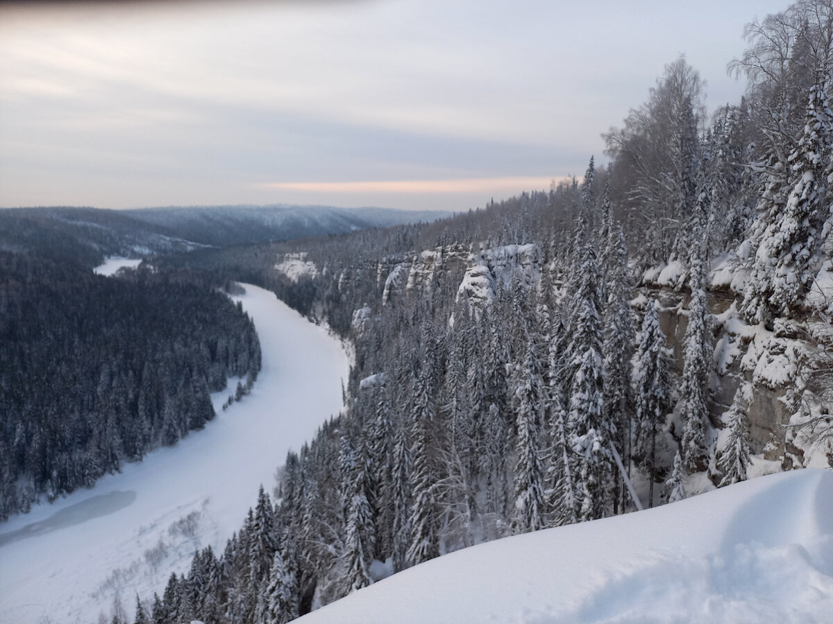 Это второй день моего путешествия по Пермскому краю. Начался он рано, ещё затемно. Но благодаря этому мы подъехали к началу маршрута на Усьвинские столбы с первыми проблесками рассвета. Заброска на снегоходе была сказочной! Я не рискнула доставать телефон в поминутно идущих на взлёт санях, так что фотографий этих моментов нет. Но это останется в моей памяти - мы неслись сквозь волшебный заснеженный лес, а сквозь просветы между сосен мелькало алым пламенем просыпающееся солнце. На вершине, на смотровой, солнце снова сковали низкие тучи. Но оно старалось пробиться, озаряя сосны, реку и скалы смесью розового и голубого. Такой рассвет в стальных тонах ) А панорамы были вдохновляющими! Кстати, на смотровую нужно было немного покарабкаться. А потом спускаться. Гид насмешила, похвалив моё сползание по снегу, назвав его "управляемым спуском" ) я бы назвала по-другому ))) Затем была чудесная тропа через волшебный зимний лес на другую смотровую. Лес был полон сказочных фигур. Под мягкими снежны