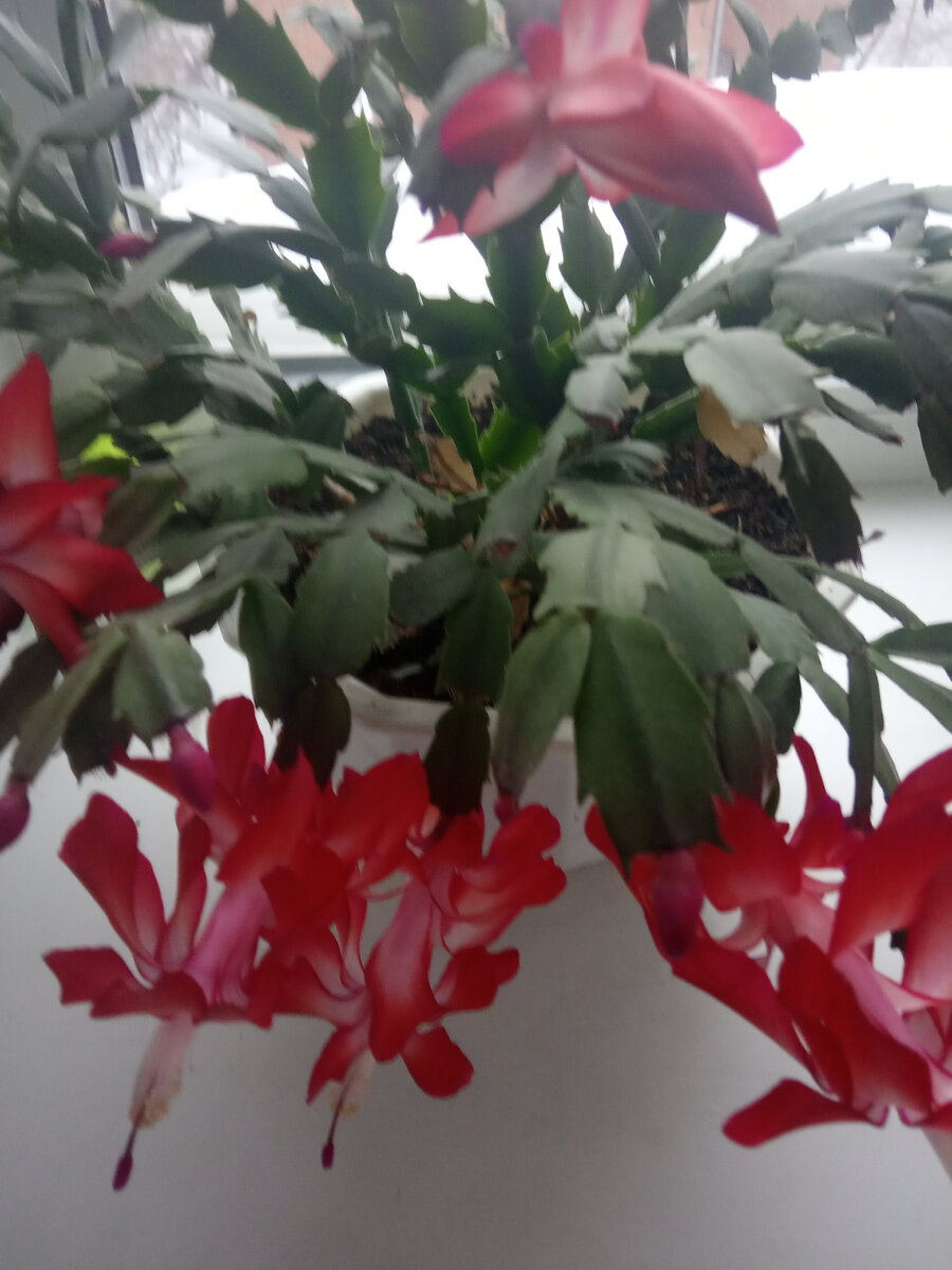 Приветствую всех читателей моего канала! Зацвел мой красавчик декабрист. Так мало зимой ярких красок. Солнца нет, снег, морозы. И именно в этот период зацветает это декабрьское чудо. У декабриста есть и другие названия Шлюмбергера, зигокактус, рождественский кактус, рождественник, иногда его называют осенним кактусом. Декабрист относится к суккулентам. Но кактус этот особенный. Он не переносит прямых солнечных лучей. Свет ему необходим, но он должен быть рассеянным. Растение не будет цвести в условиях засухи. Для нормального цветения и развития декабристу требуется постоянная влажность. Растению требуется регулярный полив и опрыскивание. И колючек у него нет, как у других кактусов. Цветет декабрист в декабре-январе. Цветы могут быть разных расцветок. Красные, фиолетовые, белые и даже оранжевые покрывают растение. Они похожи на небольшие колокольчики, которые располагаются в несколько ярусов.