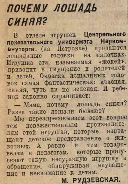 В отделе игрушек Центрального показательного универмага Наркомвнуторга (на Петровке) продаются лошадиные головки на палочках. Игрушка эта, называемая «жокей», приводит в смущение и родителей и детей. Окраска лошадиных головок самая фантастическая: красная, синяя, чуть ли не зеленая. И ребенок законно спрашивает: