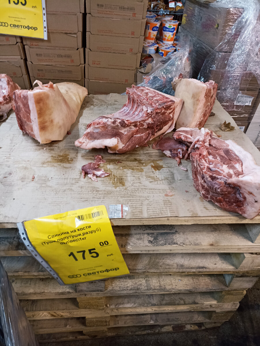 Иногда замечаю в "Светофоре" товары по удивительно низкой цене, учитывая, что сейчас январь месяц, это объяснить я просто не могу. Гранат, баклажаны, свинина и другие продукты, в этом магазине стоят гораздо дешевле, чем в соседних магазинах. И так, обзор из "Светофора" в городе Новороссийск. Свежая свинина на кости со шкурой, практически раскупается сразу и хороших кусков почти не осталось. Цена 175 рублей за 1 кг. Лопатка говяжья кусками по 1,5-2 кг, народ тоже покупает, но не так резво, как свинину. Цена 431 рубль за 1 кг. Целый холодильник мороженой скумбрии. Цена 170 рублей за 1 кг. Свежие баклажаны среднего размера, народ раскупает очень быстро. Цена всего 77 рублей за 1 кг. Гранат из Египта по невероятно низкой цене, всего 69 рублей за 1 кг. Хорошая свежая и крупная Пекинская капуста. Цена 45 рублей за 1 кг. Горчичный порошок для приготовления горчицы в домашних условиях, массой 100 грамм. Цена 17 рублей. Пищевая лимонная кислота, в упаковке 100 грамм. Цена 24 рубля. Кухонное мах