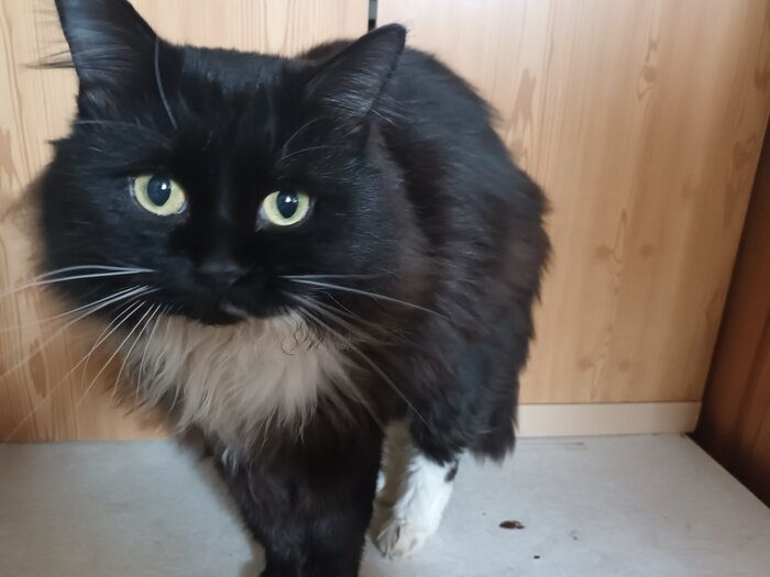 26.12.22 Утром был найден кот в мкр. Железнодорожном на ул. Пионерской, 7. До того всю ночь плакал под окнами и скулил, просился в подъезд – на улице было минус 10. Утром был отловлен на трубах отопления. С того дня и по сегодня сидит на лоджии отдельно от остальных зверей. Кот черный с белой манишкой на груди. Глазищи большие, хитрые, зрение на отлично – издалека замечает бесхозную сосиску. Из-за длинной пышной шубы кажется крупнее чем есть. На вид года 3-4. Ест сухой корм, но также с аппетитом лопает и рыбку и курочку. Ласковый. Не возражает против сидения на руках и коленях, начинаешь гладить – аж захлёбывается от счастья, пытается сразу весь подставиться под почесухи: и голову, и пузо, и спину. Не буянит, не дерет стены и мебель. Только часто жалуется, что сидит в одиночестве. Обезблошен и проглистогонен на всякий случай. На уличного не слишком похож – доверчив и ориентирован на человека. У себя оставить не можем, у нас кошка с вирусным гастроэнтеритом, а выбросить уже рука не под