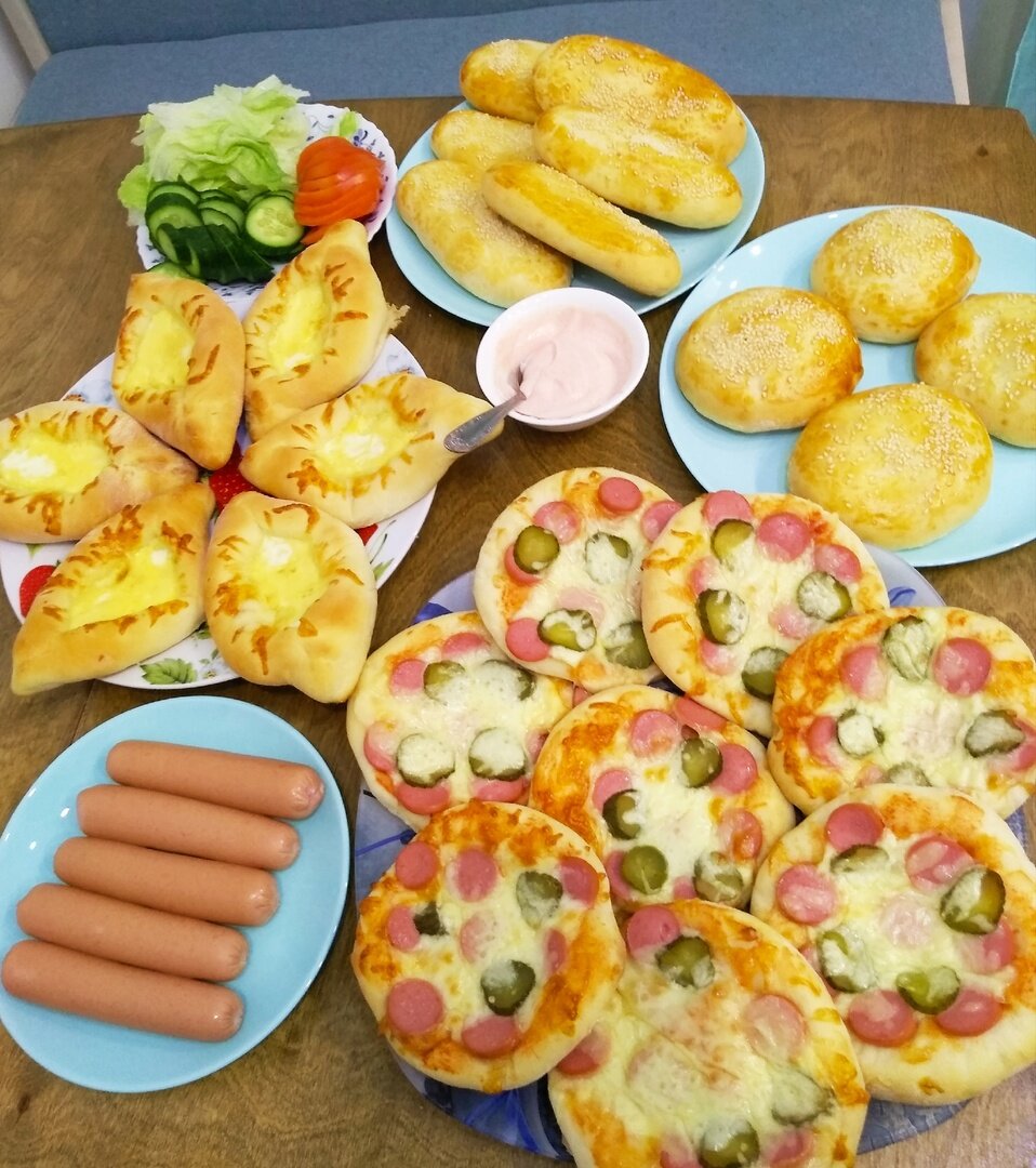 С рождеством!!! Сегодня решила сделать на ужин выпечку. Хочу вам рассказать как сделать целый пир из 1 кг муки. Всего за 500 рублей. Кстати все что вы видите на столе я приготовила из: 1 пачка сосисок (8 шт) Половина свежего огурца 2 соленых огурца 1 помидор 2 листа салата айсберг 0,5 кг сыра моцарелла 2 яйца. Тесто дрожжевое 1,7 кг (ингредиенты для него чуть ниже) Тесто: 100 мл воды и 500 мл молока смешать, подогреть. 200 мл отлить в сотейник. В остальное молоко добавить 4 ст.л сахара, 2 ч.л. соли и 50 гр свежих дрожжей (или 15 гр сухих). Взвесить 1 кг муки, просеять. В сотейник с молоком добавить 2 ст.л муки. Поставить на огонь и как масса загустеет выложить ее в молочно дрожжевую смесь. Все размешать. Добавить 3 яйца, 6 ст.л растительного масла и муку. Замесить тесто, оно должно быть очень нежным не добавляйте муку. Замешивать нужно 10 мин. В конце добавить еще 1 ст.л масла. Накрыть полотенцем миску с тестом и поставить на 1 час. Тесто делим на 24 части. И формуем то что хотим)) У
