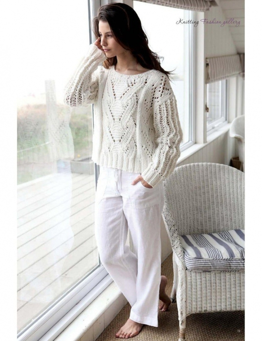 Белый - это цвет, который хорош со всех сторон. Свитера белого цвета хорошо сочетаются с одеждой любых других цветов и оттенков. Белый просто обожает узоры, и ажуры, и косы, и другие переплетения смотрятся в белом исключительно. Цвет, который подходит и для летних, и для зимних изделий. Может быть, он немного непрактичен. Но этот небольшой недостаток компенсируется всеми перечисленными достоинствами белого цвета. Белый свитер обращает на себя внимание крупным ажурным узором и красивыми ажурными вертикальными дорожками на рукавах. Схема на второй картинке, листайте галерею. Удлиненный белый свитер с ажурными дорожками и косами и шикарным воротником. Еще один белоснежный шедевр связан узором рис скомбинированным с другими "плетенками". Удобная деталь - высокий воротник застегивается на молнию в боковом шве. Кос много не бывает. Особенно в зимнем свитере. Широкие и узкие, с редкими переплетениями и более частыми, косы образуют на свитере настоящий зимний узор. Еще один интересный вариа