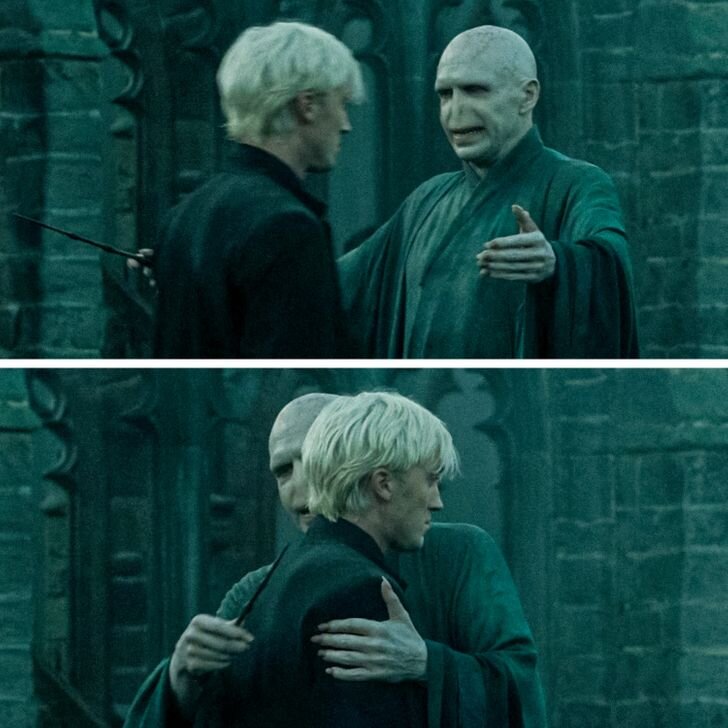 Импровизация В третьем акте фильма "Гарри Поттер и Дары Смерти. Часть 2" Драко Малфой переходит на сторону Волдеморта только ради своих родителей. Он совершенно не испытывает никакой радости, что вот-вот защитники Хогвартса падут. Это также отлично видно по его реакции, когда Волдеморт заключает Малфоя-младшего в свои объятия, однако на самом деле это не совсем реакция Драко. на самом деле это была импровизация Рэйфа Файнса, который решил обнять проходящего мимо Тома Фелтона. Учитывая то, что Волдеморт в своей жизни вряд ли хоть когда-нибудь кого-либо обнимал, это объятие стало максимально неловким для обоих.