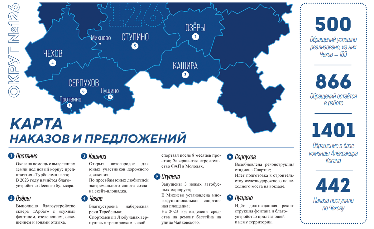 Всего за год совместными усилиями нам удалось успешно реализовать 183 наказа и обращения, поступивших из Чехова.
