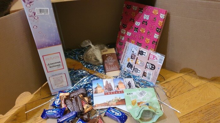 Вот и я добралась до написания отчета для своего Дедушки Мороза. Хочу ещё раз поблагодарить его за такой чудесный, уютный и новогодний подарок, который прилетел ко мне из Смоленска. Сразу весь подарок, уже распакованный: Здесь всё, что радует моё сердечко: и мозаика с котиком, и вкусности, и пряности для готовки и закладки, и скетчбук. И даже прелесть мятная для нашего инспектора, она первая в посылку полезла: Сейчас будет покрупнее детали, чтобы похвалить и похвастаться лишний раз ^_^. Приправы для приготовления разных блюд. Как раз испробовали - очень вкусно, ароматно и разнообразно. Вкусный сладости, шоколад из шоколадной мастерской, ниже будет вид его. Первый раз такой пробовала - необыкновенный вкус. И не горчит, и не сильно сладкий, прям в самый раз. Мозаика моя новая, в мою коллекцию с котиками:) Будет время - соберу. Моя любовь к канцелярии и котикам: 2 в 1. Таких закладок в коллекции ещё нет. Вознаграждение нашего инспектора, долго рассматривала и принюхивалась. Первый раз она