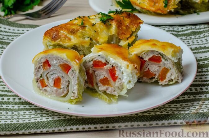 Рулетики из пекинской капусты с фаршем и болгарским перцем. «Голубцы» в тесте. Ленивые голубцы с пшеничной крупой. Голубцы без риса с жареным беконом. «Голубцы» в тесте. Мясная начинка заворачивается не в капустные листья, а в тесто. Почти пельмени, только большие и с рисом. Обжариваются на сковороде, а затем немного тушатся в соусе. Получается очень вкусно и оригинально. Ленивые голубцы с пшеничной крупой – отличное блюдо, способное полноценно насытить, но не утомить процессом приготовления. Измельчённая капуста смешивается с мясным фаршем и отварной пшеничной крупой. Формируются котлеты и запекаются в духовке в томатно-сметанном соусе. Несложно и очень аппетитно. Голубцы без риса, тушенные на сковороде, с жареным беконом, получаются не только вкусными, но и очень ароматными. Сперва обжаривается на сковороде бекон, который используется для подачи. Затем в той же сковороде тушатся голубцы. А на основе жидкости, оставшейся после тушения голубцов, можно приготовить соус. Сытное, вкусное