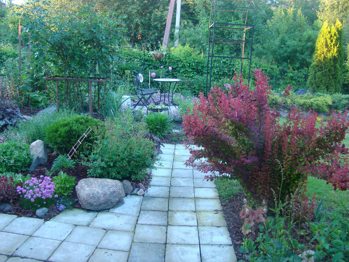 Центральная дорожка пропадает под ветками барбариса Тунберга и гортензией. А за ними та самая лужайка... Ее отсюда почти не видно.