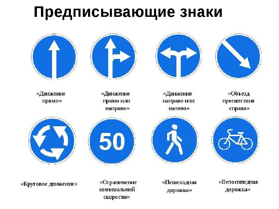 Предписывающие знаки указывают направление транспортных средств на пересечениях проезжих частей, минимальную скорость движения, места движения пешеходов и велосипедистов. Устанавливаются в непосредственной близости от места, где вступает в силу предписание и могут повторяться, если компетентные органы считают это необходимым. 4.1.1 "Движение прямо". Разрешается движение только прямо в случае, когда знак установлен непосредственно перед пересечением проезжих частей Если знак установлен в начале участка дороги (т.е. на каком-либо расстоянии до пересечения дорог), то в этом случае знак не запрещает поворот только направо во дворы и на другие прилегающие территории (заправки, стоянки отдыха и т.п.). Действие знака не распространяется на маршрутные транспортные средства. Зона действия знака: a) действие знака распространяется на пересечение проезжих частей, перед которым установлен знак (только на первое пересечение за знаком); б) если знак установлен в начале участка дороги, действие зна