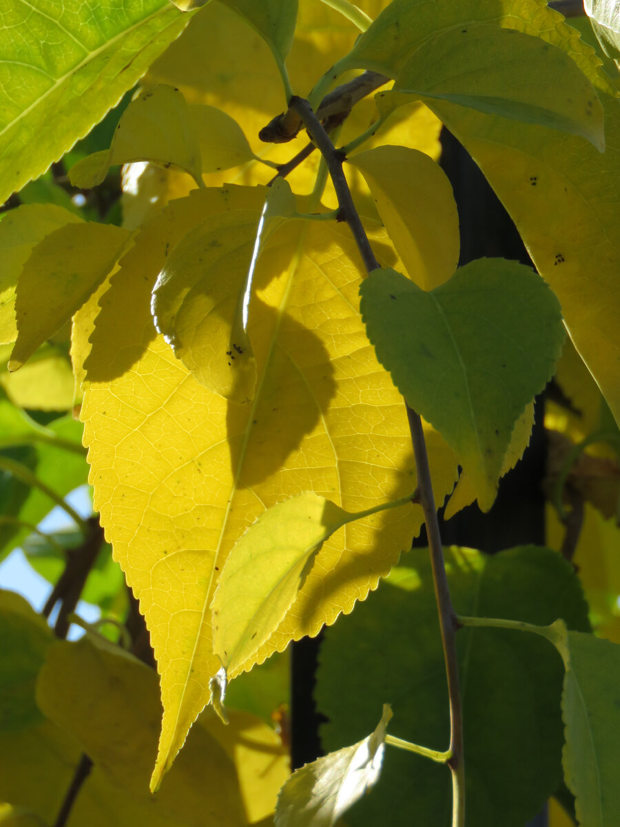Ради мимолетности вот этой янтарно-желтой, почти прозрачной, осенней окраски я готова терпеть от ДРЕВОГУБЦА все😁 И ежегодное подмерзание почти на четверть, с последующим , почти моментальным восстановлением. Дальневосточный товарищ не любит наших вымораживающих ветров, а любит зимовать в сугробе. Но где ж у нас сугроб -то найдешь на те минимум 3 метра высоты ( с 12 максимум). И траты😁 на железную устойчивую опору. Чтоб смог обвиться своими стеблями по ней и только по ней. Нечего покушаться на соседний бархат со своим моментальным восстановлением. И просто зеленый цвет листвы почти всегда до осени...Ни тебе ярких цветочков, ни ягодок... Но вот эта осенняя окраска, недолгая, скоротечная, как и у всех дальневосточников, меня восхищает и радует..