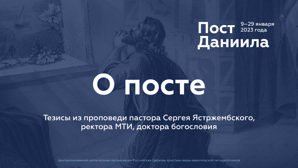 Тезисы из проповеди пастора Сергея Ястржембского, ректора МТИ, доктора богословия Определение поста Пост, поститься [евр. цум, «затягивать (внутренности)»] — добровольное воздержание от пищи на определённое время. Есть индивидуальный пост и есть совместный. Пост — не голодовка. Пища не приближает нас к Богу и не удаляет от Него. Бог не реагирует на то, что мы не едим. Бог реагирует на веру. Древние народы с помощью поста и молитвы пытались манипулировать богами. Иисус полностью отверг это и дал наставление, как поститься. Он произносит слова: «Когда поститесь…» (Мф. 6:16), и мы понимаем, что это было обычном делом для людей того времени. Цель поста Важно поставить правильную цель поста. В Ветхом Завете большое внимание уделялось внешней стороне поста. В Новом Завете Иисус говорит, чтобы мы показывали сокрушение и смирение в тайной комнате, а не на людях. Не делайте шоу из поста. Во время поста важно читать Божье Слово и молиться. Вы можете заменить пищу на молитву и Божье Слово. О пост