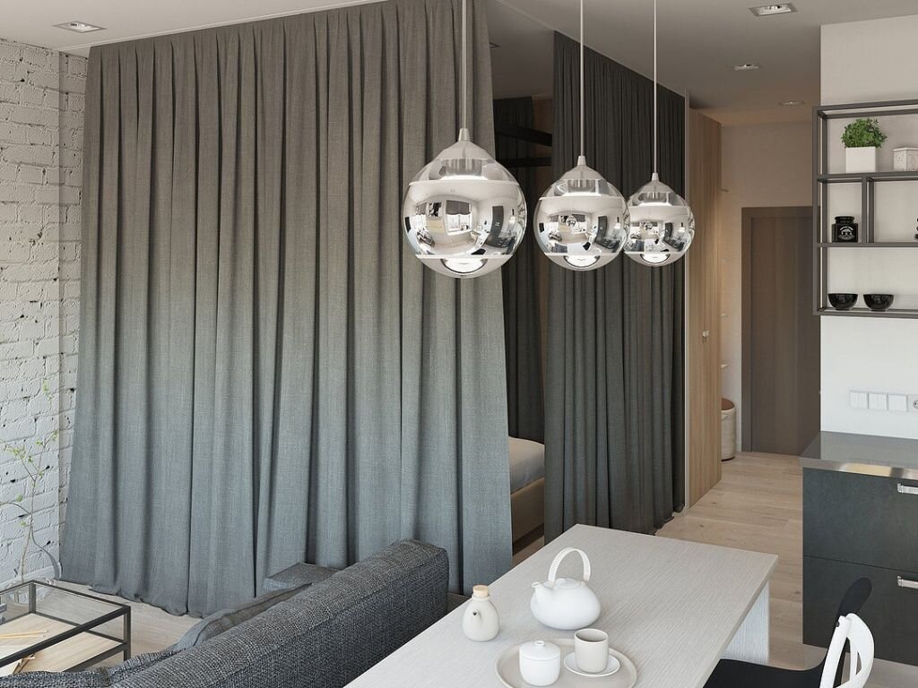 Маленькую квартиру можно разграничить, чтобы у каждого члена семьи было свое укромное местечко. Вы ожидаете прибавления в семействе, и нет возможности поменять квартиру на жилплощадь большего размера? Вам не хочется отягощать большую комнату перегородками? Или вам просто захотелось четкого разграничения таких зон, как спальня и рабочий кабинет, или гостиная и детская? Тогда вам следует задуматься о визуальном разделении одной большой комнаты на небольшие жилые зоны. Зонирование ширмами, шторами, мебелью Если у вас нет ни времени, ни желания возиться с таким затратным ремонтом, то самым простым решением станет установка ширмы или штор на границе участков. Хотя здесь необходимо учитывать стиль комнаты. Особенно гармонично шторы и занавески впишутся в помещение, обставленное в скандинавском стиле, но совершенно не подходят для современной элегантной комнаты. Если необходимость разделения пространства возникает только лишь на короткий промежуток времени, а в другое время оказывается помехо