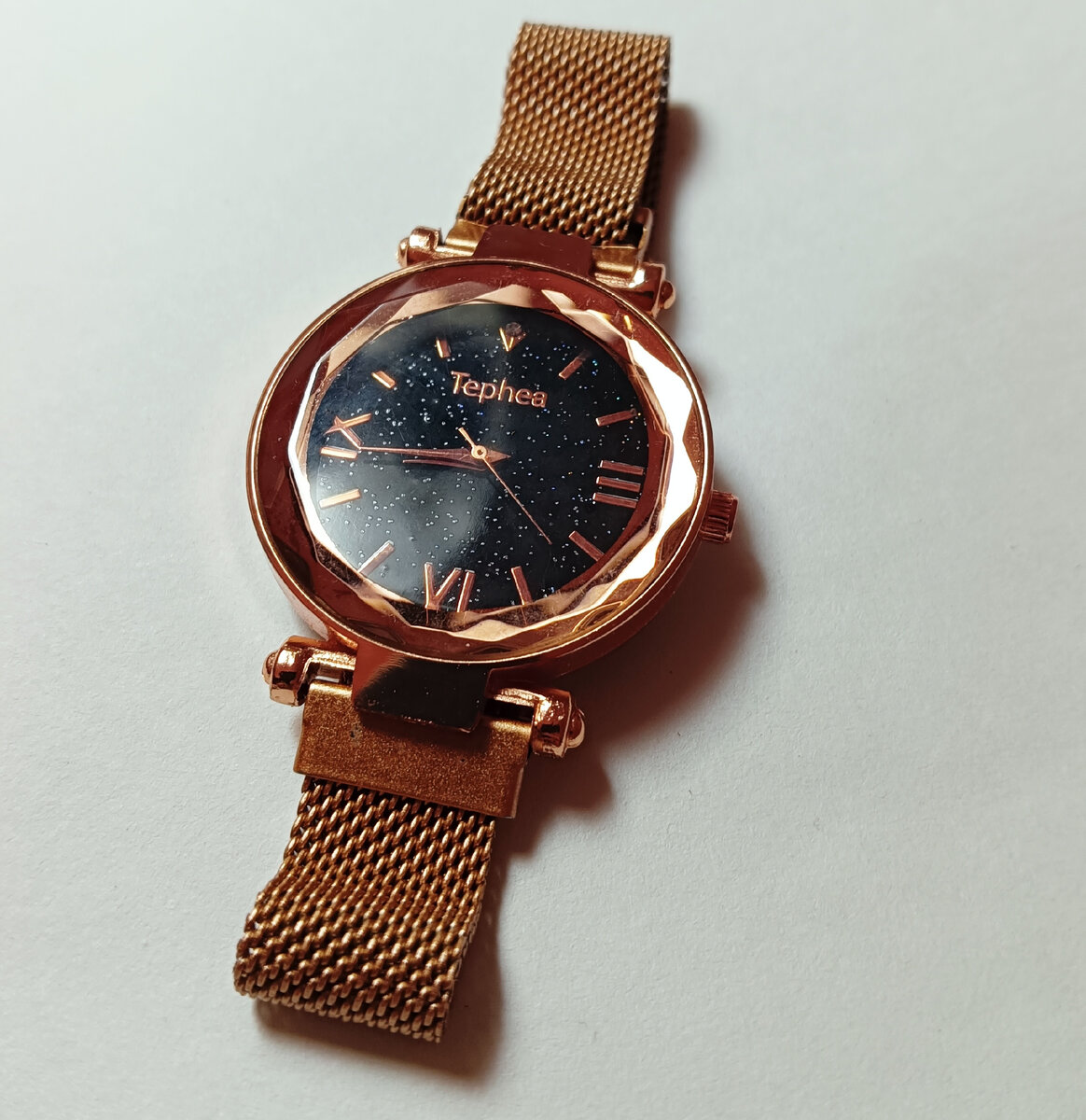 Доброго времени суток! Буду менять батарейку в таких вот симпатичных часиках. Часы с магнитным браслетом - кстати довольно удобно, можно легко отрегулировать под нужный размер руки, и магнит достаточно сильный, хорошо держит. Открыл крышку-хлопушку - достаточно тугая. В часах установлен самый обычный кварцевый механизм. Немного отвел пружинный фиксатор и старую батарейку можно легко вынуть. Буду устанавливать хорошую батарейку. Батарейку установил - часы пошли. Стрелки установлены не совсем точно - часовая ровно, а минутная на 10 минут не совпадает - буду исправлять. Вынул часы из корпуса, снял минутную стрелку и установил ровно на 12 часов, теперь порядок. Часы собрал, теперь всё отлично. Всем удачных ремонтов!