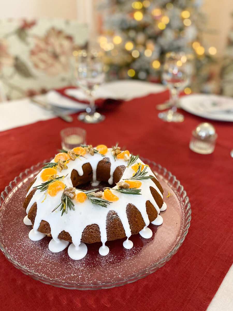 Покрыть глазурью кекс, оставшейся глазурью мы покрыли ещё и имбирное печенье. Сверху глазури кекс украсила мандаринами, грецким орехом и розмарином, сверху припорошила для снежного эффекта сахарной пудрой.